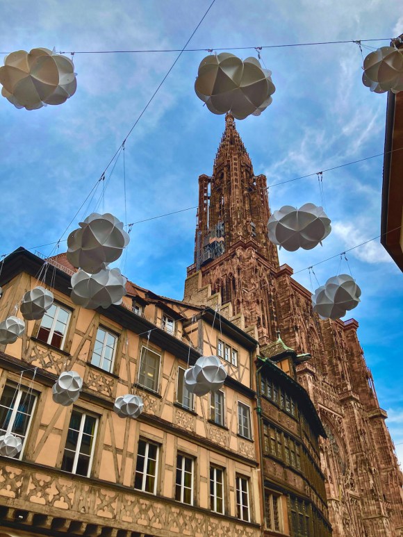 • La poésie de « PORTÉE AUX NUES » (Bénédicte Bach) : un ciel onirique de nuages, fabriqués à partir de tanneries, en suspension au-dessus de la rue des Hallebardes, avec la Cathédrale en toile de fond.