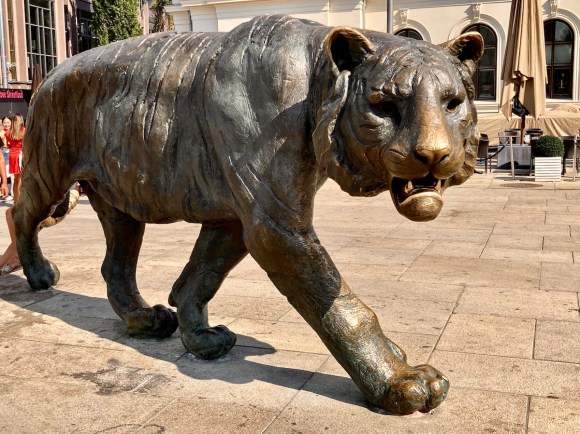 La façade rouge du bâtiment est ornée d’éléments marins de la mythologie grecques (tritons, néréides).