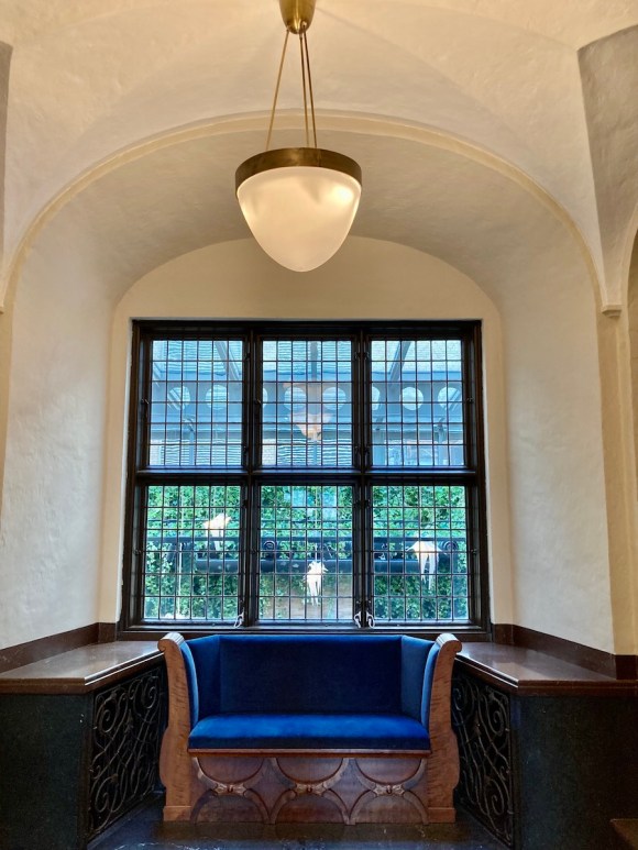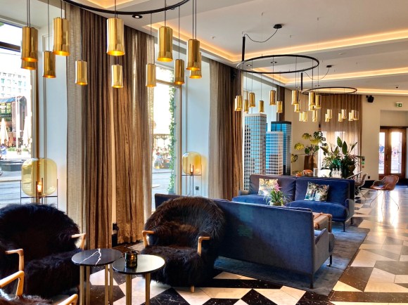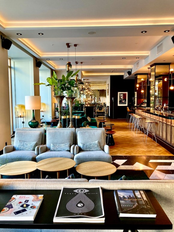 L’esthétique harmonieuse des différents espaces – réception, salon, bar (Pier 42), brasserie (Atlas) et chambres – s’inscrit dans l’héritage des paquebots du XXe siècle. Elle associe luxe (matériaux nobles comme le velours, le cuir ou le marbre) et minimalisme urbain (carrelage métro, palette monochrome et accents de couleur, miroirs patinés et luminaires de style industriel). De grandes malles servent de tables basses dans le salon de la réception.