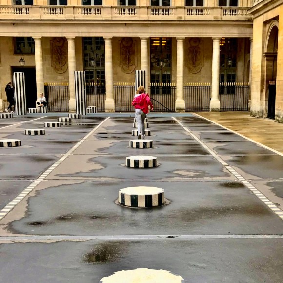 Nous rejoignons ensuite les 260 colonnes octogonales rayées de noir et de blanc réalisées par l’artiste Daniel Buren. La magie du lieu incite chacun à s’approprier les colonnes selon son envie. Les enfants les transforment en montagnes à gravir, en parcours de pierres au-dessus d’une rivière imaginaire ou en poteaux de slalom géant. Les plus grands s’installent sur les colonnes pour se reposer, discuter, prendre le soleil ou les utilisent comme décor pour leur selfie. Il faut avouer que nous n’avions pas joué à saute-mouton depuis longtemps. « Toutes les grandes personnes ont d’abord été des enfants » avait dit Antoine de Saint-Exupéry. Les colonnes de Buren en sont l’illustration parfaite.