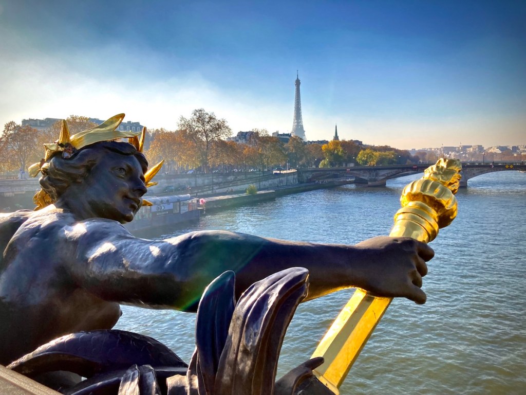 Depuis le milieu du pont, au-dessus de la tête d’une statue de nymphe, nous profitons de la perspective sur la tour Eiffel alors entourée d’un halo de brume automnale. En un instant, le soleil fait son apparition et la brume se dissipe.