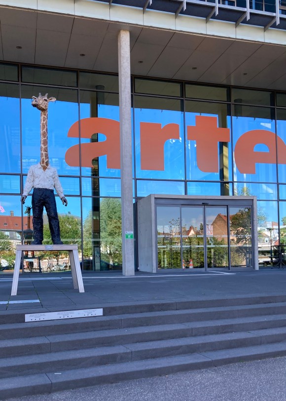 Traversez la passerelle Ducrot, faites un selfie avec l’Homme Girafe (de l’artiste Stephan Balkenhol) sur le parvis du siège d’ARTE (chaîne télé culturelle franco-allemande).
