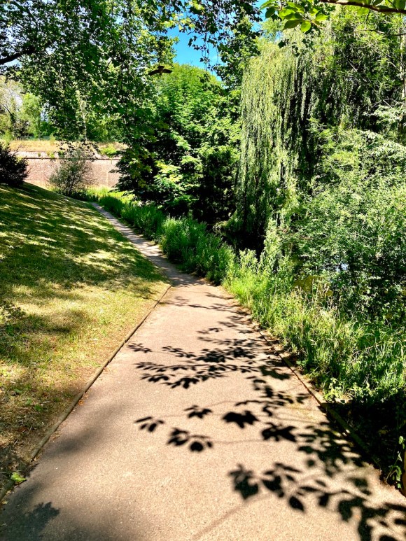 Un cours d’eau paisible serpente dans les anciennes douves. Des libellules virevoltent entre les nénuphars. Un cygne fait sa toilette alors que des tortues de Floride se prélassent sur un rocher au soleil. Sur un pont, un groupe d’enfants est lancé à la recherche du « crocrodile » (imaginaire) de la Citadelle.