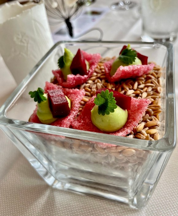 Le menu Plaisir porte parfaitement son nom : plaisir des sens et plaisir partagé par le chef animent chaque assiette. La cuisine est gourmande, authentique et inventive. Un parfait équilibre des recettes traditionnelles et de la modernité (avec notamment une incursion dans la cuisine moléculaire pour la Neige à la rose qui lance les hostilités du Festival des desserts). Même si les compositions sont ancrées avec fierté en Alsace, l’influence italienne est aussi palpable (Lucienne, la mère du chef, est italienne).