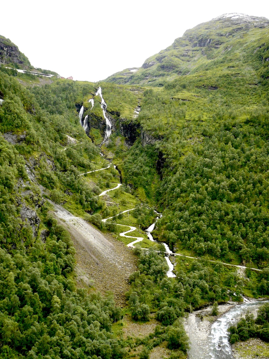 Le circuit se poursuit en train, sur la légendaire ligne de Flåm, l’une des plus raides au monde. Le train serpente à travers des paysages de montagnes spectaculaires et s’arrête quelques instants au niveau de la cascade Kjosfossen.