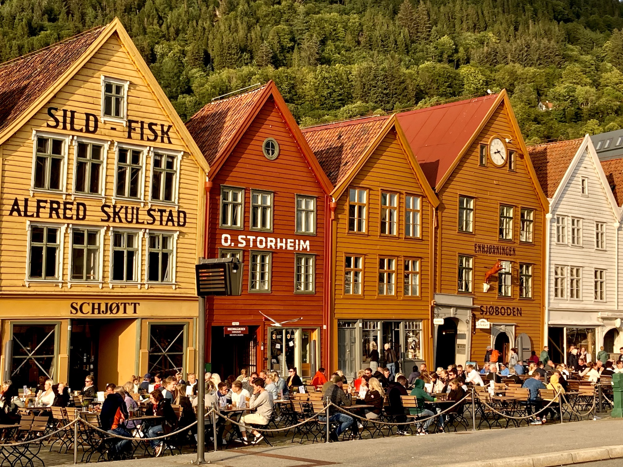 Bryggen est le quartier historique de Bergen, au bord du vieux port. Du XIVe au XVIe siècle, la ville était un comptoir commercial de la Ligue hanséatique. Le quai de Bryggen, inscrit au patrimoine mondial de l’UNESCO, est un héritage de cette époque. L’aspect actuel des 62 maisons colorées est semblable à celui du quartier tel qu’il a été reconstruit après l’incendie de 1702, dans un style médiéval. Parfaitement conservées, les maisons en bois et en pierre abritent aujourd’hui des musées, des boutiques, un hôtel et des restaurants (dont les terrasses se remplissent instantanément dès l’arrivée du soleil en été).