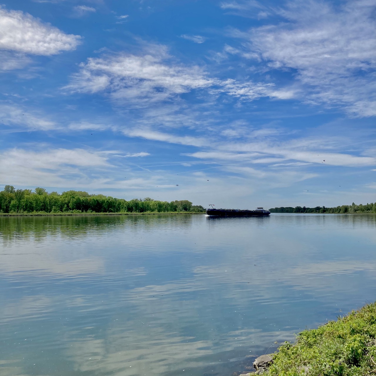 Promenez-vous sur la digue vers la gauche (en direction de la commune de Gambsheim, avec en arrière-plan les sommets de la Forêt Noire) – notre recommandation – ou vers la droite (en direction de Strasbourg). Face à vous, sur l’autre rive, l’Allemagne. Sur votre parcours, vous verrez certainement passer une péniche naviguant sur le Rhin.
