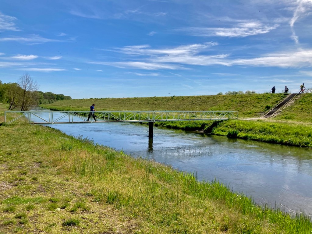 Marchez quelques centaines de mètres sur la digue, tournez ensuite à nouveau à droite (fléchage sur un arbre vers Gambsheim-Le Rhin) et prenez le pont vert mentionné ci-dessus pour rejoindre le Rhin.