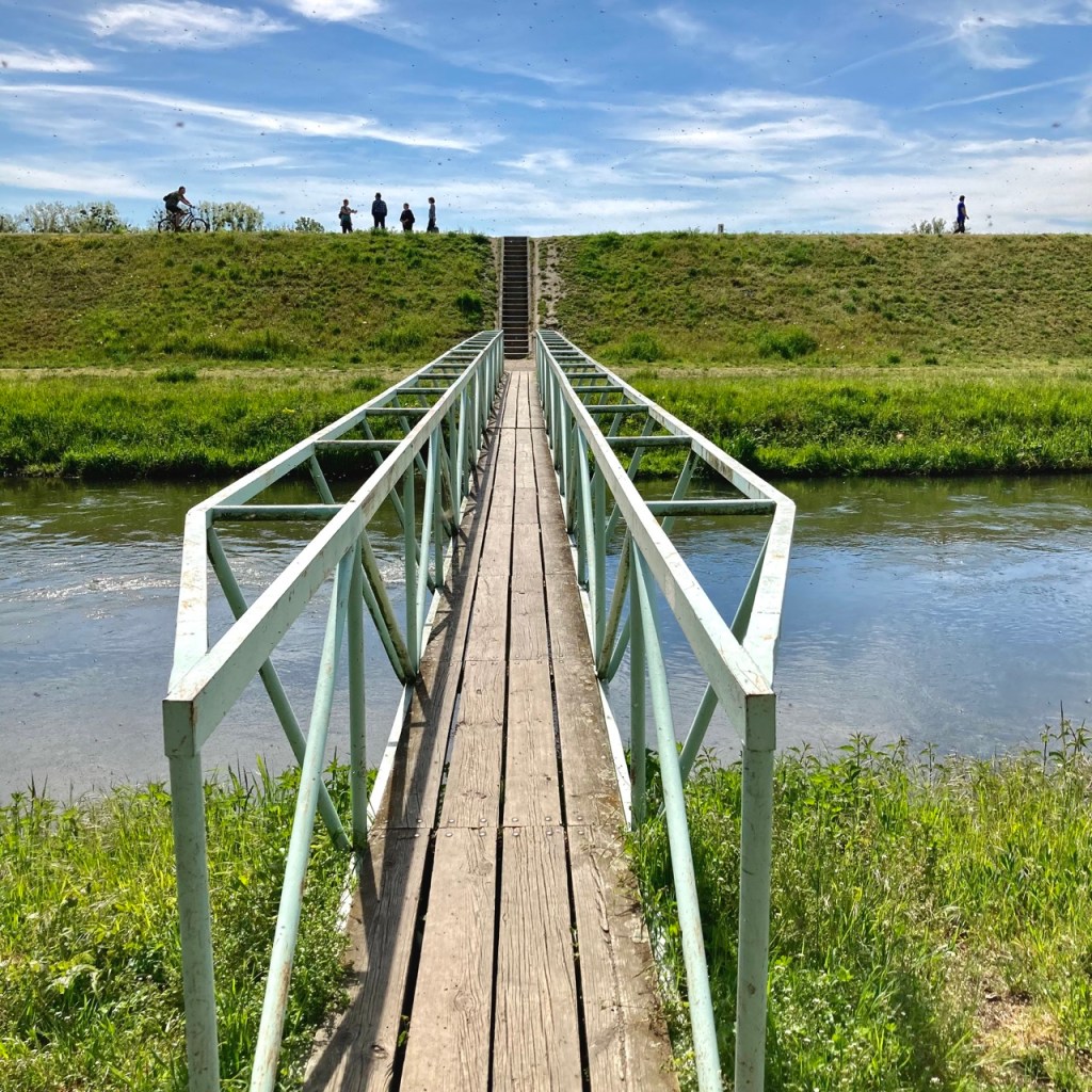 À la sortie de la forêt, suivez la route goudronnée puis traversez le pont vert (piétons/vélos). Montez la volée de marches pour arriver au bord du Rhin