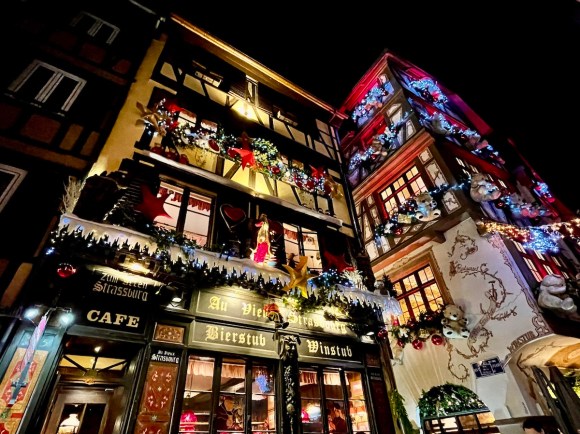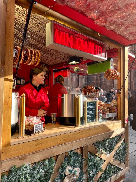 Les sens en éveil, on s’empreigne des odeurs de vin chaud, de rocher coco, de gaufre moelleuse, de tartes flambées et de sapin fraîchement coupé. Le bourdon de la Cathédrale sonne les vêpres. Les enfants s’émerveillent devant les décorations et les guirlandes lumineuses. Un commerçant à la voix de baryton raconte des boutades à un client. On se réchauffe avec un jus de pomme chaud à la cannelle ou un vin chaud de Chez Mathilde, place Broglie. « Il est bon, il est chaud, le vin chaud ! »