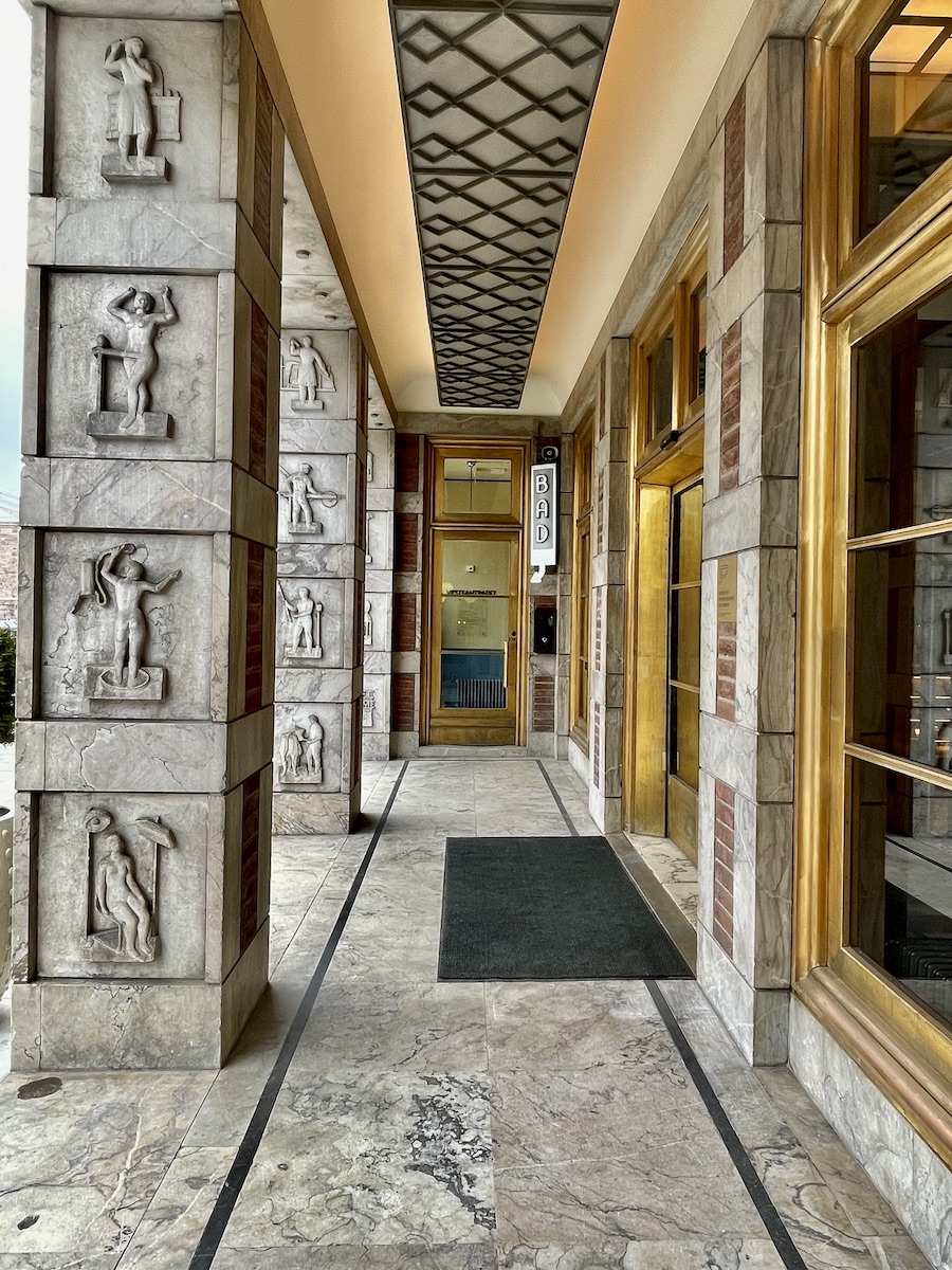 Les colonnes à l’entrée du bâtiment sont rehaussées de reliefs qui soulignent l’importance de l’électricité et portent la mention « Lumière, énergie, chaleur ».
