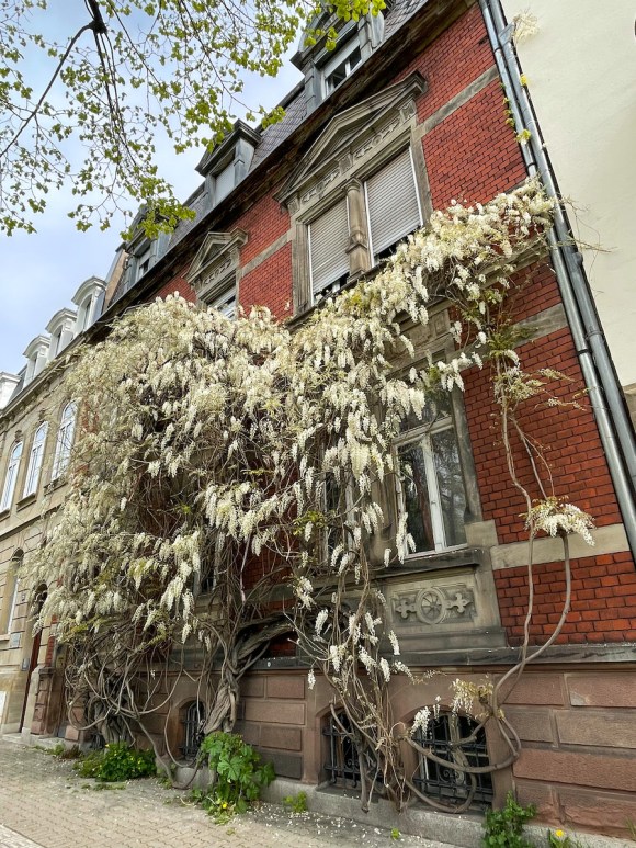 La façade du n°1 rue Fischart est festonnée de glycines qui grimpent le long des briques.