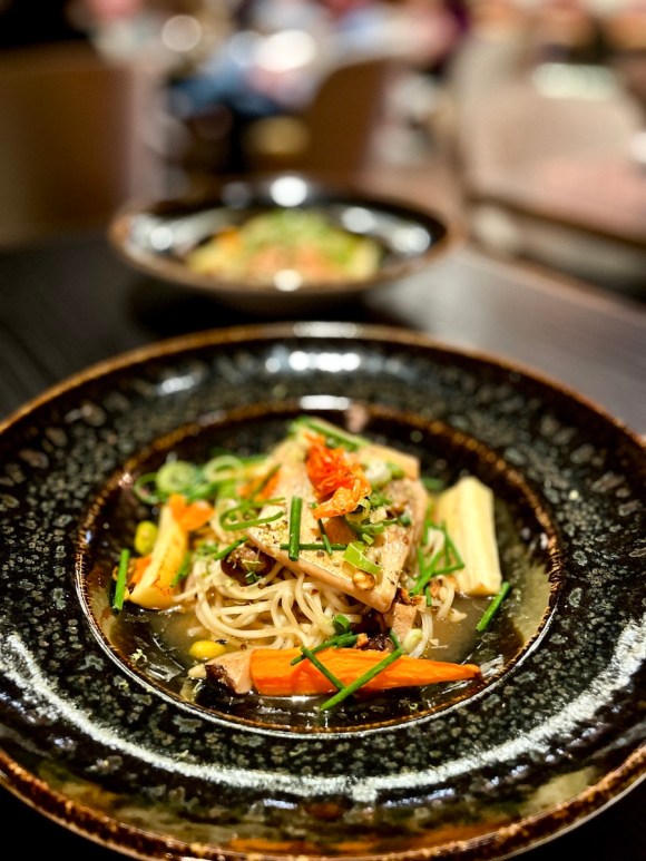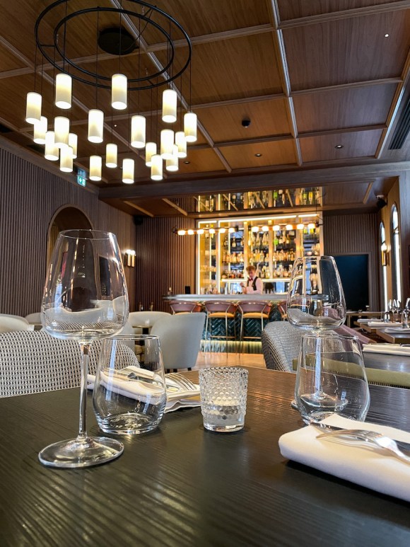 En soirée, l’espace est baigné d’une lumière tamisée et intimiste. Les plats imaginés par le Chef Jonathan Rauch sont frais, locaux et de saison. Les saveurs umami du sandre poché, bouillon dashi, légumes racines, shiitakes, crevette et ramen sont particulièrement bien équilibrées.