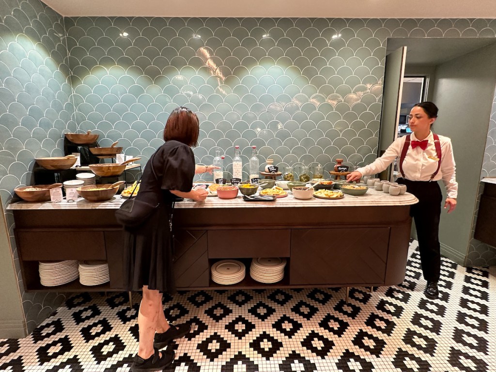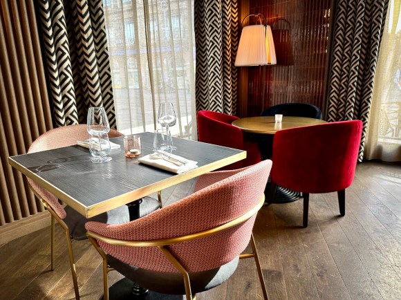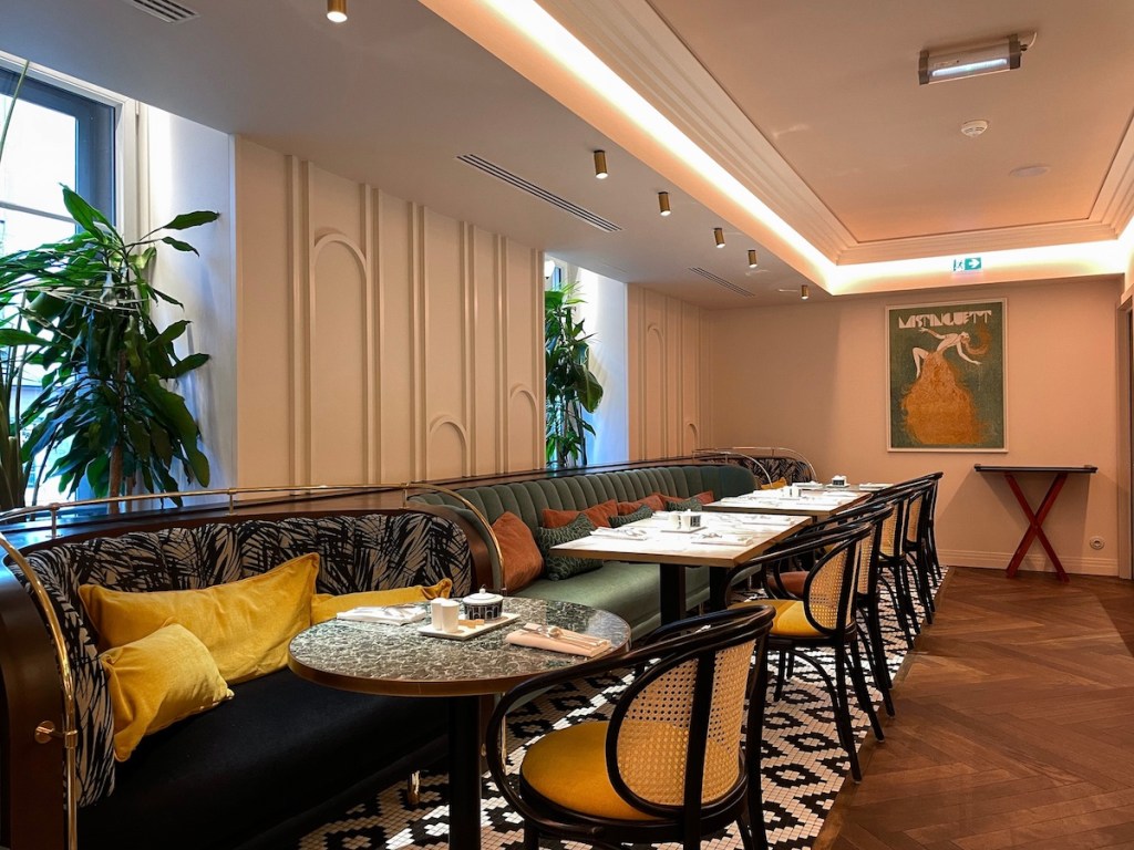 Le petit déjeuner (comme le brunch du dimanche) est servi dans le charmant Salon Mistinguett. L’ambiance tout en rondeur, avec des tons pastels et poudreux, des canapés en velours et du mobilier en marbre, compose un cadre élégant et agréable. Le buffet varié et savoureux comble toutes les envies sucrées et salées.