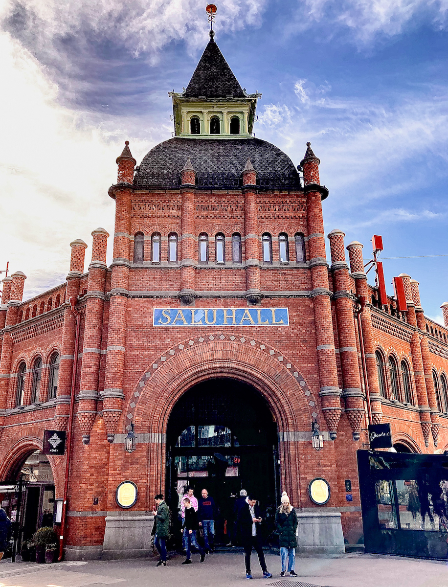 Nous avons découvert ces halles au hasard de notre exploration d’Östermalm. Notre attention a d’abord été attirée par l’impressionnante architecture en briques rouges du bâtiment.