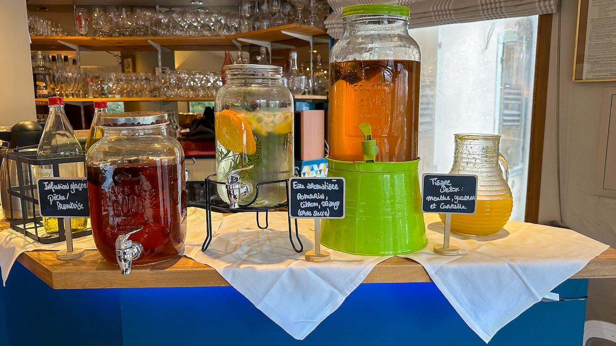 Les thés et tisanes Dammann Frères, le café filtre, le chocolat chaud et les boissons fraîches (jus de fruits, infusion glacée, eau aromatisée, thé detox) sont compris. Une carte de boissons spéciales permet d’agrémenter le brunch : crémant, champagne, vin blanc, vin rouge, expresso, cappuccino, latte macchiato et limoncello maison.