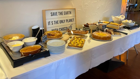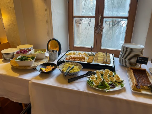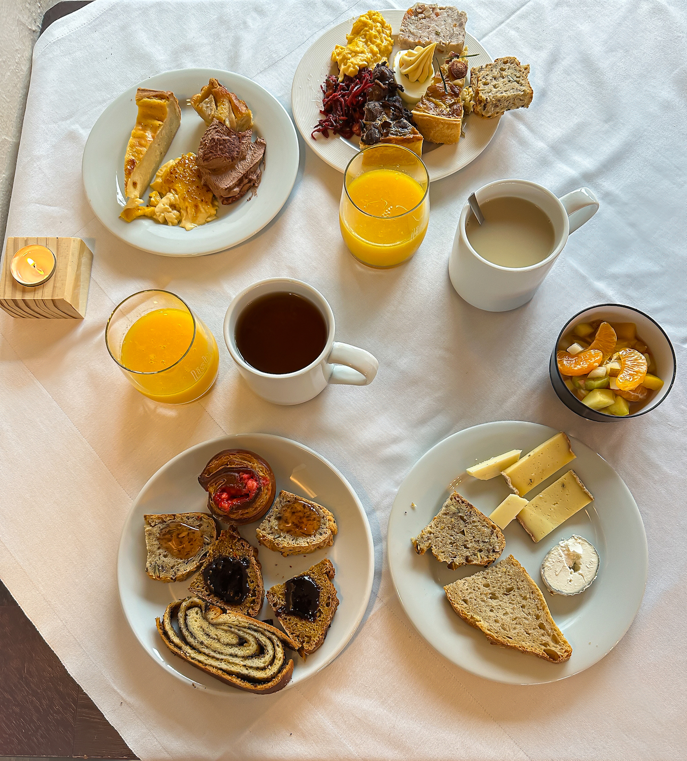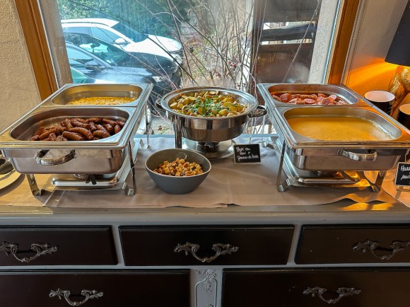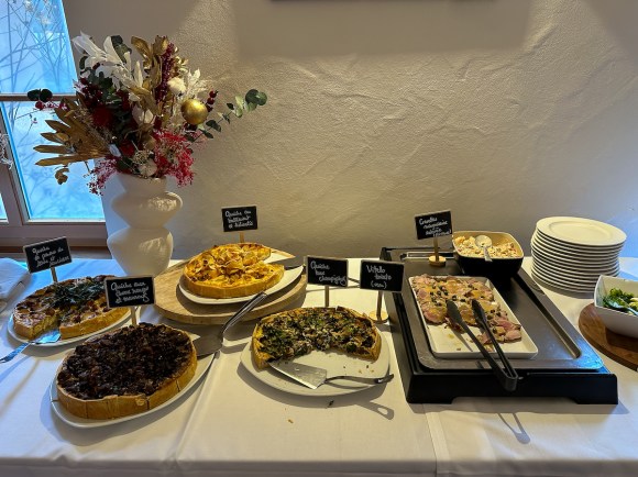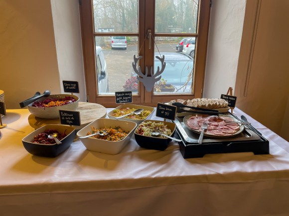 Mentions spéciales pour la quiche chou rouge-marrons, la salade betterave-cajou, le généreux plateau de fromages, le pain maison et confitures maison (dont celle aux myrtilles), le crémeux mûres meringue citron, la salade de fruits frais, la tarte au fromage blanc et le chocolat chaud aux noisettes. Les végétariens trouveront facilement leur bonheur : quiches, salades, œufs mayonnaise, salade d’œufs de caille…
